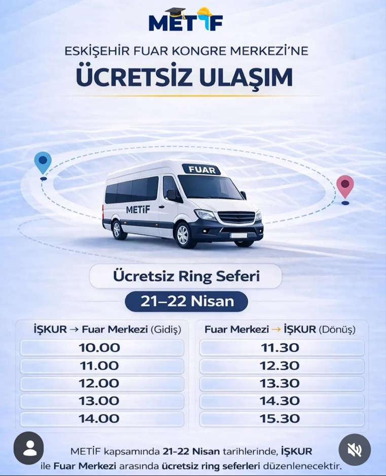 Ayrıca İŞKUR tarafından; 21-22 Nisan 2026 tarihlerinde Eskişehir Çalışma ve İş Kurumu İl Müdürlüğü (Cumhuriye Mah. Cengiz Topel Cd. No:64) önünden fuar alanına aşağıda belirtilen saatlerde ücretsiz ring seferleri düzenlenecektir.