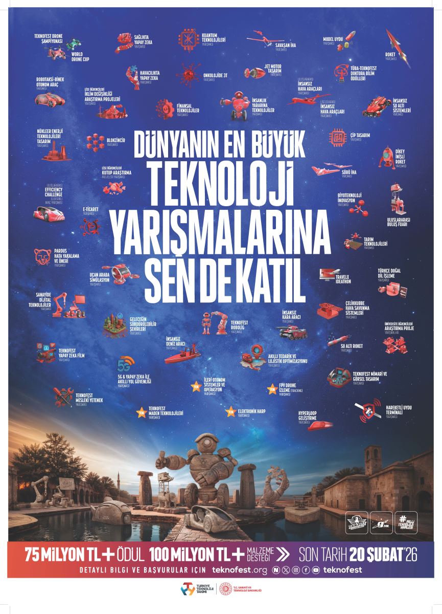 TEKNOFEST 2026 kapsamında; Roket, Model Uydu, Robotaksi – Binek Otonom Araç, Savaşan İHA, Çip Tasarım, BlokZincir, Hava Savunma Sistemleri, Finansal Teknolojiler, İnsansız Deniz Aracı ve TEKNOFEST Mesleki Yetenek Yarışması başta olmak üzere toplam 52 farklı teknoloji yarışması düzenlenecektir.