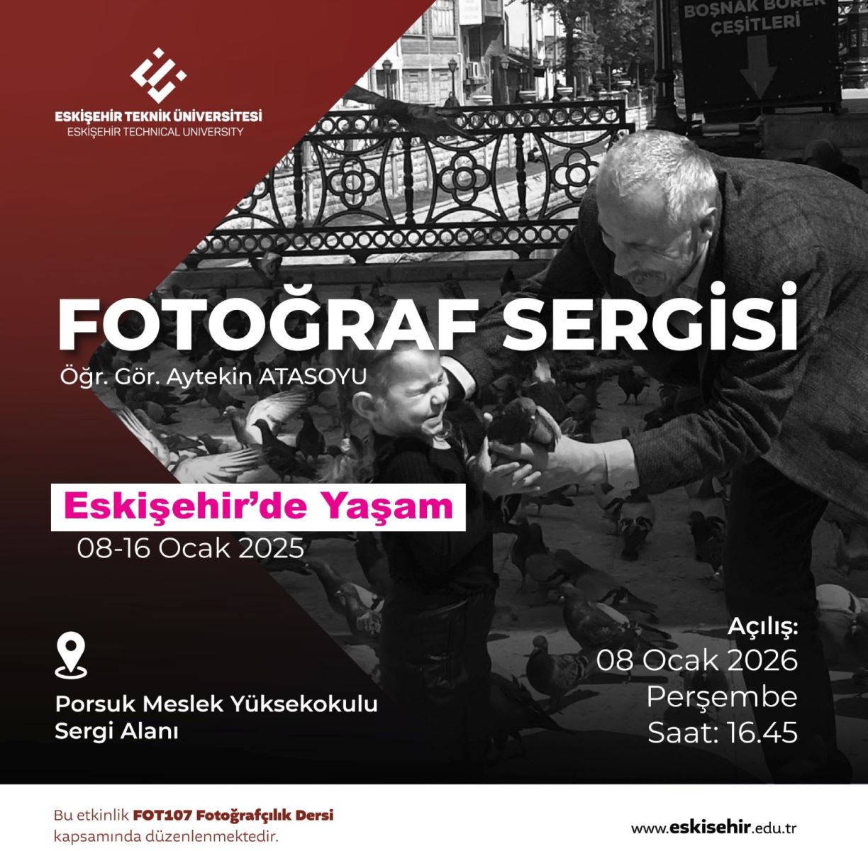 Yüksekokulumuz Öğretim Elemanlarından Öğr.Gör. Aytekin ATASOYU Hocamız tarafından organize edilen ve FOT107-Fotoğrafçılık Dersi kapsamında hazırlanan "Eskişehir'de Yaşam" temalı Fotoğraf Sergisi Yüksekokulumuz giriş katındaki sergi alanında sergilenecektir.