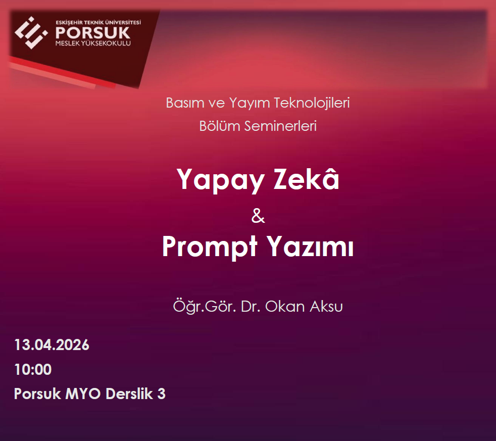 Basım ve Yayım Teknolojileri Bölüm Seminerleri kapsamında, Öğr. Gör. Dr. Okan AKSU tarafından ‘Yapay Zekâ ve Prompt Yazımı’ semineri 13 Nisan 2026 tarihinde saat 10.00’da Porsuk MYO Derslik 3’te düzenlenecektir.