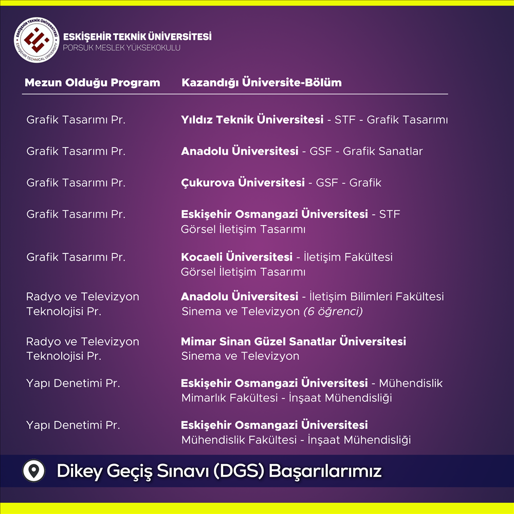 2025 Dikey Geçiş Sınavı (DGS) sonuçlarının açıklanmasının ardından, Yüksekokulumuz mezunlarının başarıları bizleri gururlandırmıştır.